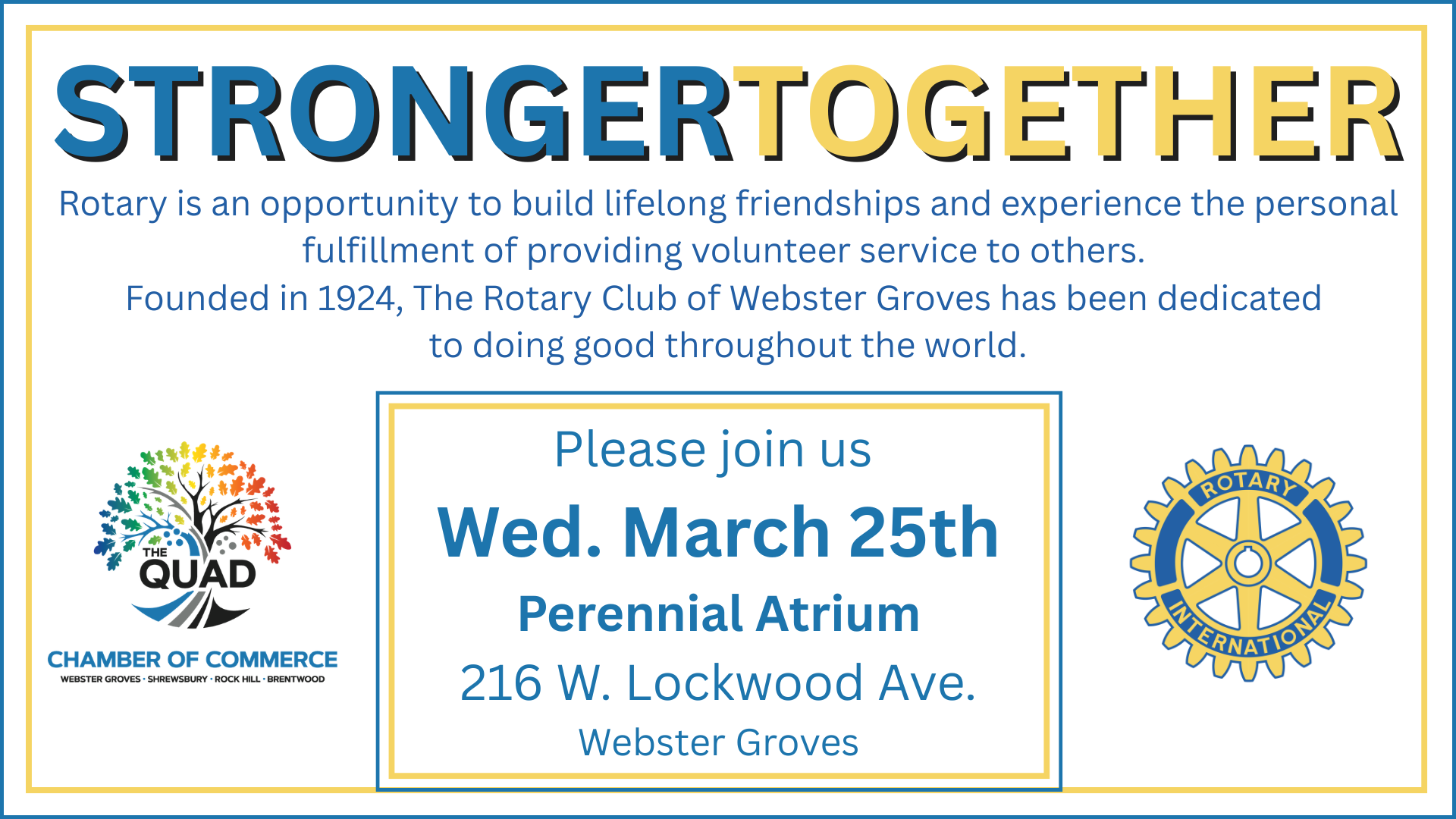 The Webster Groves/Shrewsbury/Rock Hill /Brentwood Chamber is the premier business organization in the Webster Groves/Shrewsbury/Rock Hill area. We serve three traditional, yet progressive inner-ring St. Louis suburban cities: Webster Groves, Shrewsbury and Rock Hill, and we exist solely to promote our businesses and surrounding communities - a role we have filled since 1937.